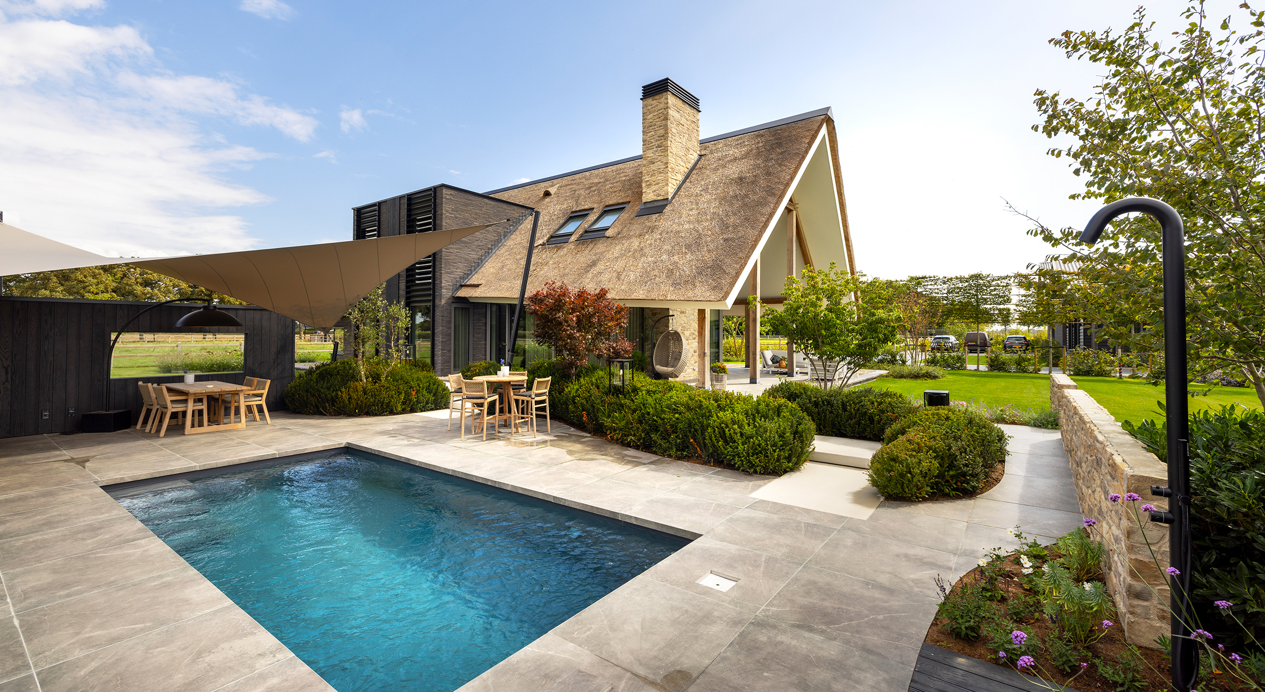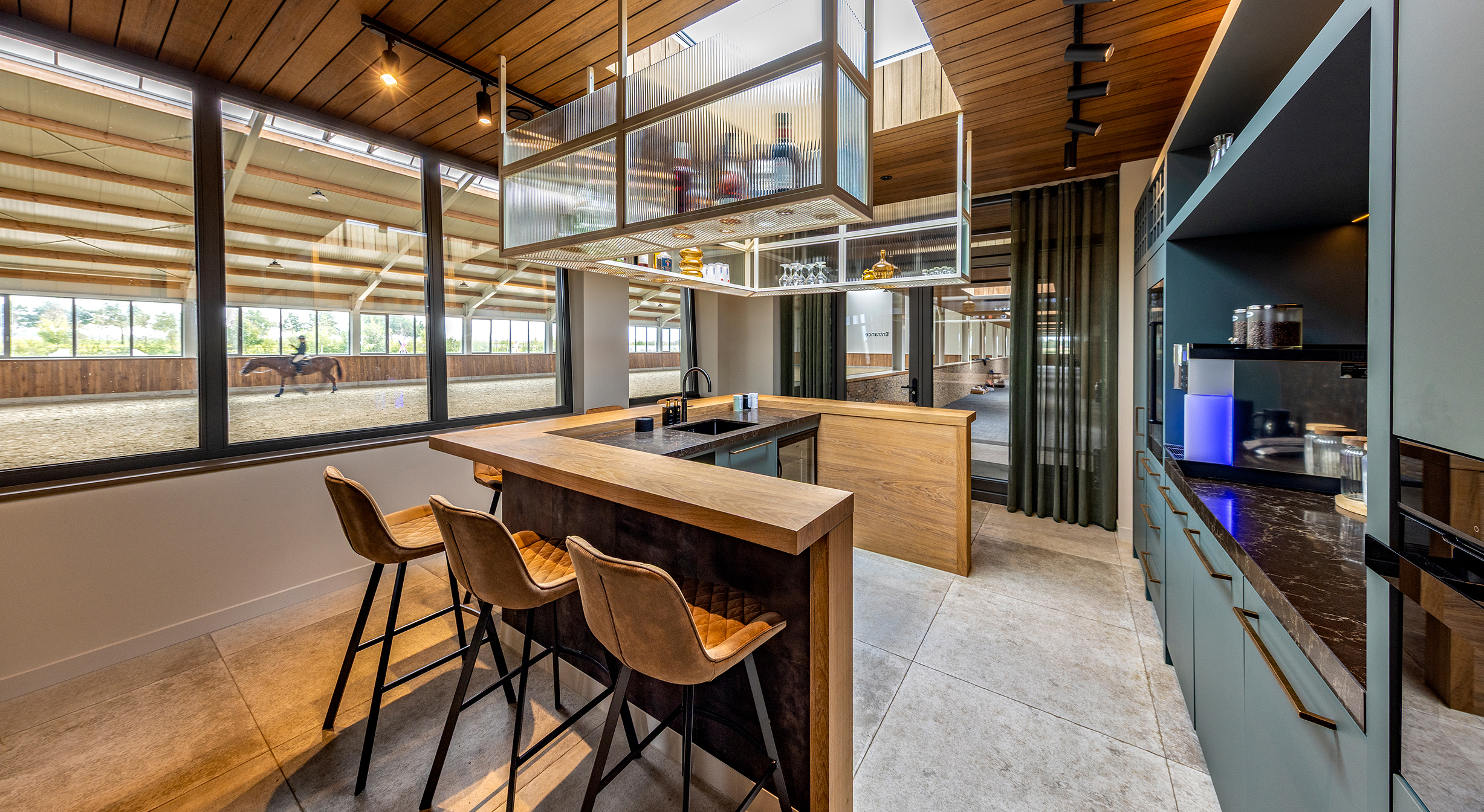 Deze barruimte combineert een verfijnd design met een huiselijke sfeer. Het gebruik van warme houttinten en elegante materialen zorgt voor een luxueuze, maar toegankelijke uitstraling. De centrale bar met hoge zitplaatsen vormt het kloppend hart van de ruimte.